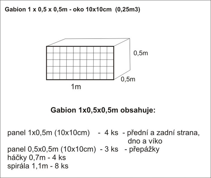 Gabionový koš o rozměru 1 x 0,5 x 0,5m (0,25m3) se skládá z 4 ks sítí 1x0,5m a 2 ks sítí 0,5 x 0,5m, 4 ks háčků 0,5m, 4 ks spirál 1,1m a 8 ks spirál 0,6m. Oko 10x10cm.