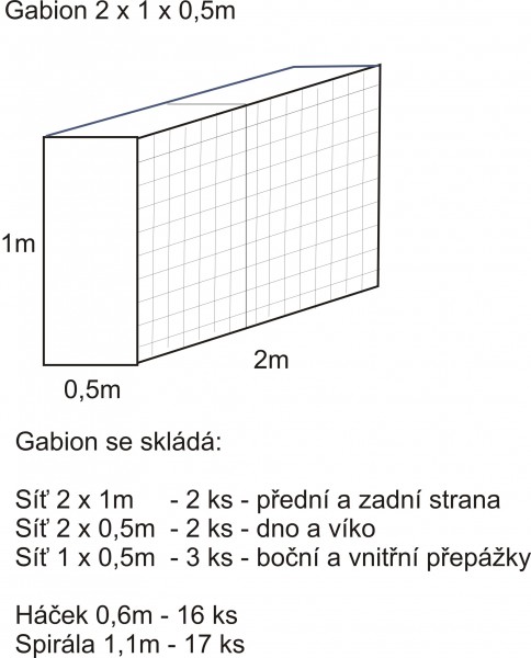 Gabionový koš o rozměru 2 x 1 x 0,5m (1m3) se skládá z 2 ks sítí 2x1m, 2 ks sítí 2 x 0,5 a 3 ks sítí 1x0,5m, 16ks háčků 0,5m a 17 ks spirál 1,1m. Oko 10x10cm.